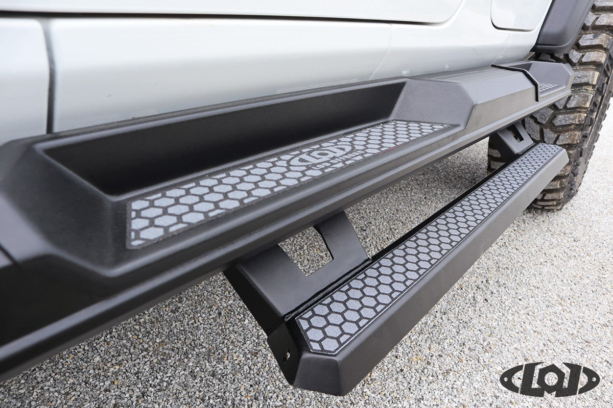 Configurable and modular design allows the addition of individual drop steps or larger one piece drop steps for easy entry and exit from your Jeep.