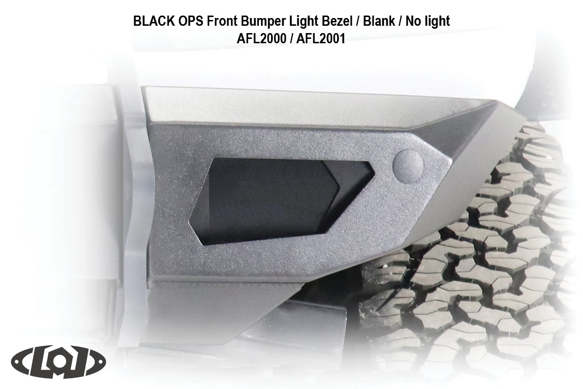 LoD Offroad Black Ops Front Light Bezel (pair). These bezels ship as a pair with both 1 passenger and 1 driver side included. Our Bezels come in bare Steel or with a super durable 2 stage corrosion resistant powder coated finish. Please select from the bezel options on this page to change and add lighting options for your Bronco BLACK OPS front bumper order.