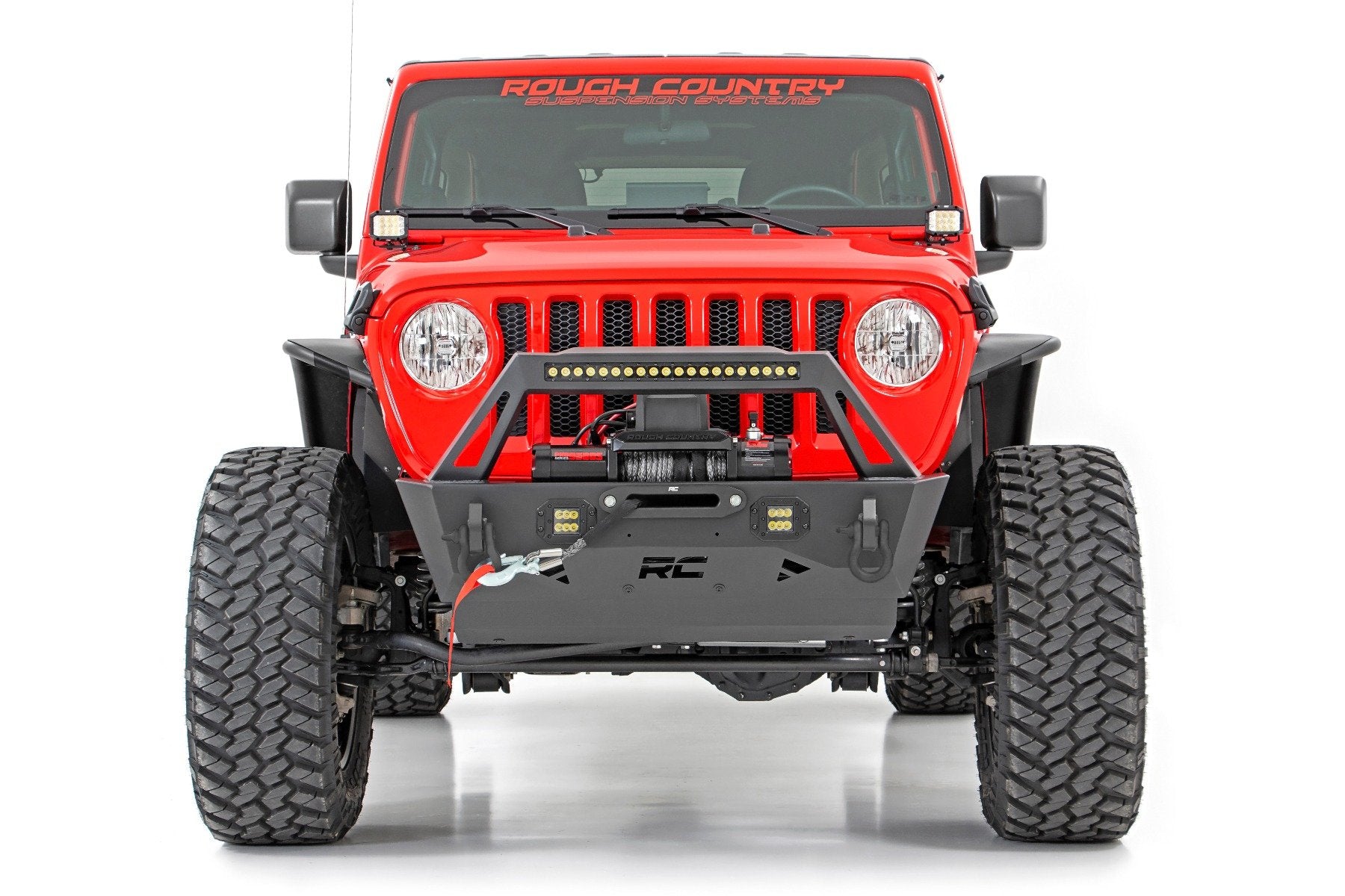 Rough Country's Jeep Stubby?”Front Trail Bumper is the ultimate combination of form and function, giving you an arsenal of off-road tools while giving your Jeep a mean, aggressive appearance.The stubby design offers fantastic clearance for better approach angles while a protective skid plate ensures unbeatable protection in off-road environments.Featuring a set of Rough Country's black-series 2in flush-mount LED cubes and 20in single-row light bar, this bumper offers plenty of forward-facing illumination to help you light up the trail ahead. Each bumper also features a set of D-ring shackles for a convenient recovery point, as well as a winch plate allowing you to install any standard-sized winch.Rough Country's Jeep Stubby?”Trail Bumper is engineered with a durable, steel construction and powder coated flat black for a long lifespan of corrosion resistance and great looks.