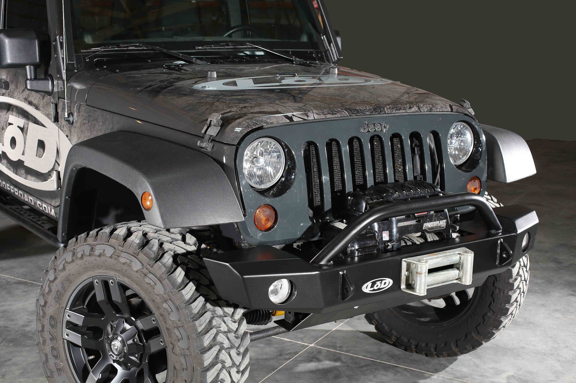 The LoD Signature Series Mid-Width is constructed of 3/16" steel. The bumper includes two clevis mounts and comes standard with a winch mounting plate. The winch mounting plate is constructed of 1/4" steel. The bumper also provides a way to mount the factory fog lights or we can supply a light kit with supplies for those lights. If our kit is purchased, it will come with two 55 watt halogen lights and a wiring kit, including a switch. An optional guard is also available, as well as a bolt-on skid plate for EVEN more added protection. You will have a choice of coating options. The semi-gloss textured coating is a close match to the factory fender flares.