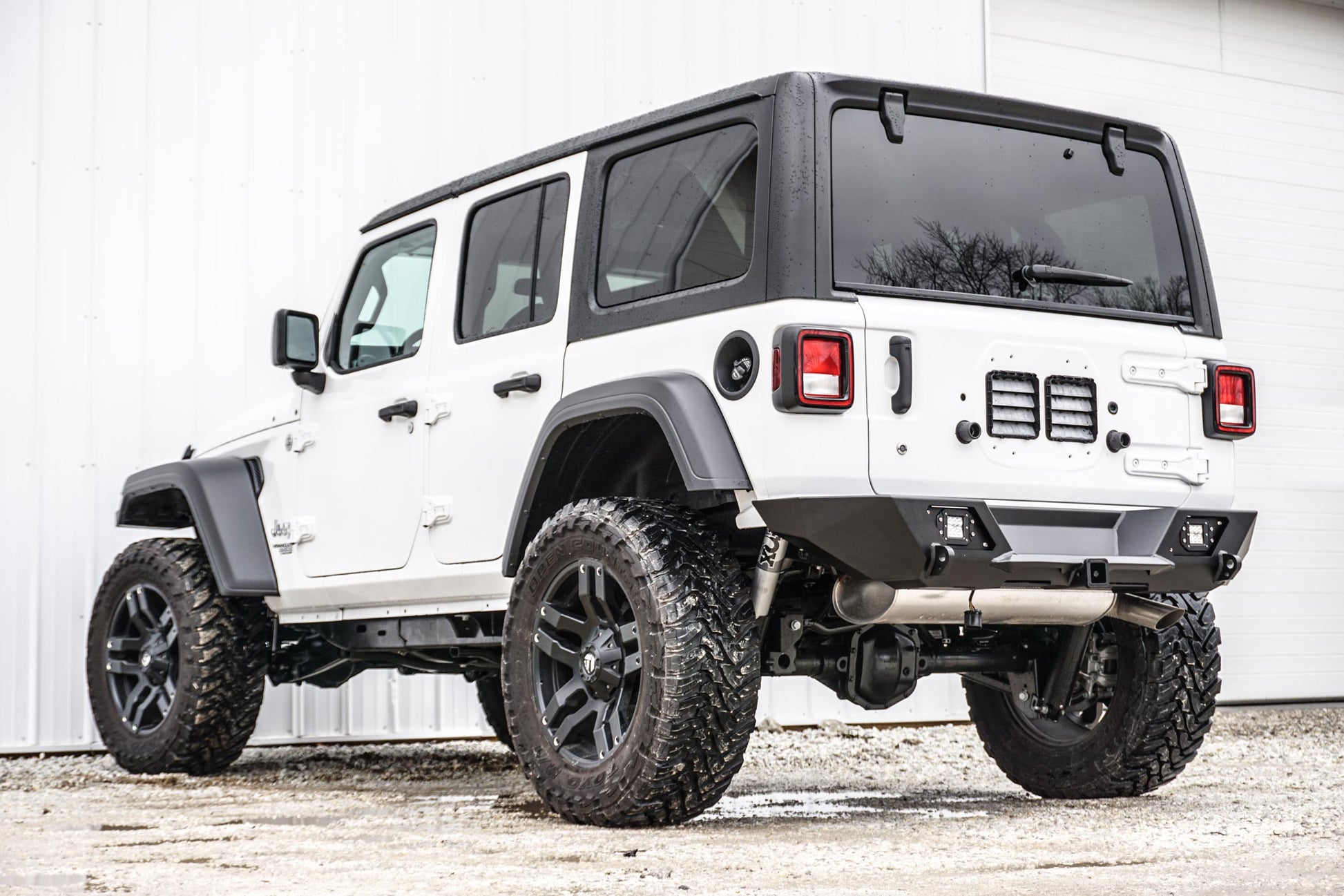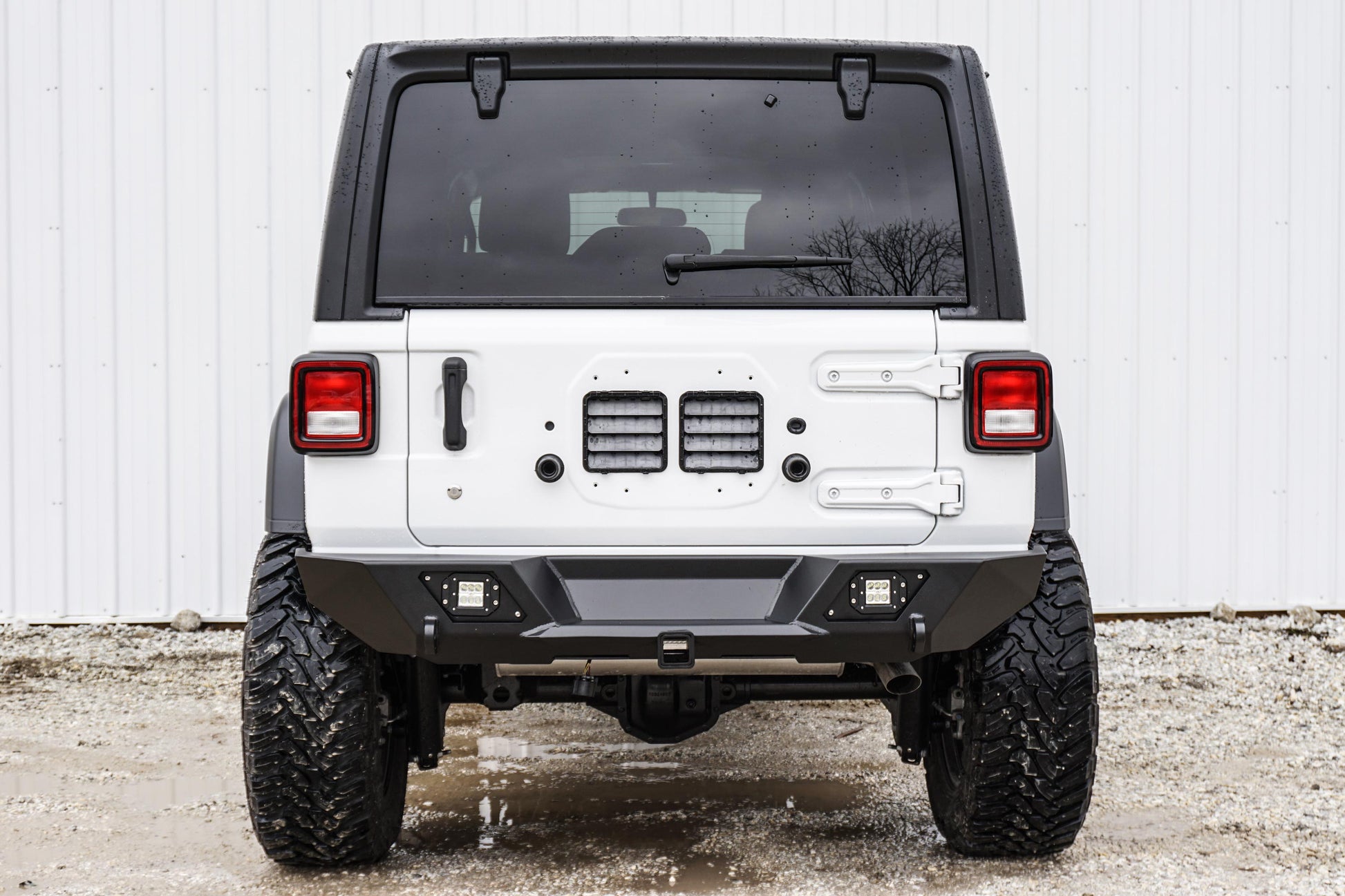 New Jeep Wrangler Destroyer Shorty Bumpers are engineered to a higher level. The stealthy look and versatile functionality makes a bold statement while protecting and enhancing your off road Jeep on the trail. The increased features allow you to customize your Jeep like never before! The rear bumper has been upgraded with light bezels which allow easy light change out by removing a few screws. The Destroyer rear bumpers fit round 4" lights, Rigid D-flush mount, and Rigid D series LED lighting by switch out the bezels. Orders with no lights will receive blank bezels to fill the light housing cavity. The Destroyer rear bumper will work with the factory tire carrier and fits up to a 35" tire comfortably. Optional Tire Riser Mounts can be used to fit larger tire sizes with factory carrier. The tow hitch receiver is built into the rear bumper and is tow rated the same as the factory. (3500 Lbs.) Better look, higher quality, and more options! Note: Tire Carriers can Not be Added to rear bumper only orders later! New Features Include: -New enhanced Destroyer bumper design with less catch points -Fits 35" inch tire with factory Jeep carrier -Riser mount available for 37" inch tires with factory carrier -New enhanced light bezel design that prevents mud build up and easy to change lighting options -Accommodates round or square Rigid LED lighting options -Stronger high strength/ light weight military grade steel -More tire clearance -Built-in replacement tow hitch receiver (Tow rated same as stock 3500 Lbs.) Note: Bumper is shown with upgraded attachments which are Not included in the listed base pricing. All weights are of the bumper only with no options included.