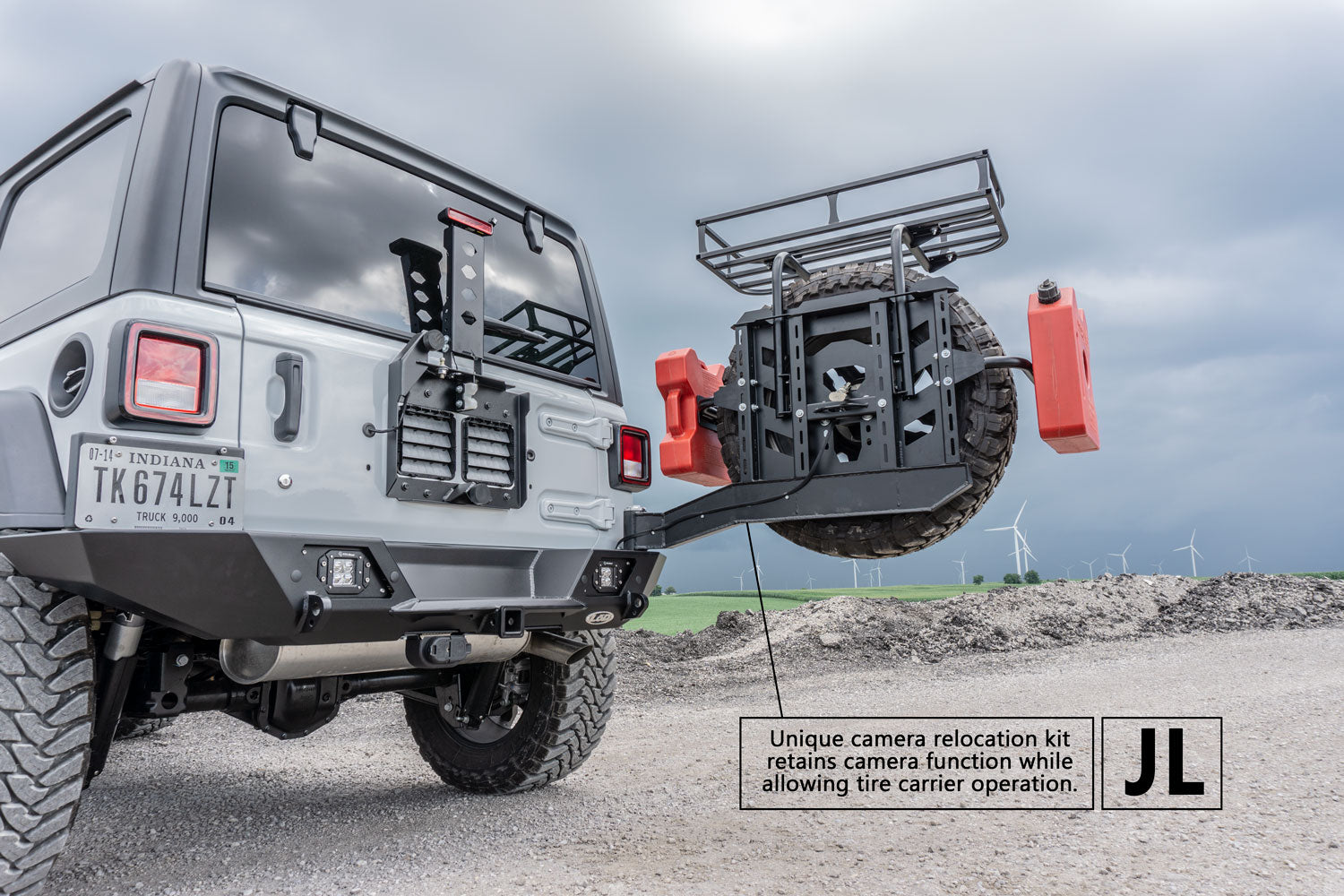 The LoD Offroad JL Rearview Camera Relocation Kit will help you relocate your camera and wiring harness so your tire carrier can swing open independantly from the Jeep door. This is made possible with the use of our custom made extention wire and camera mount.